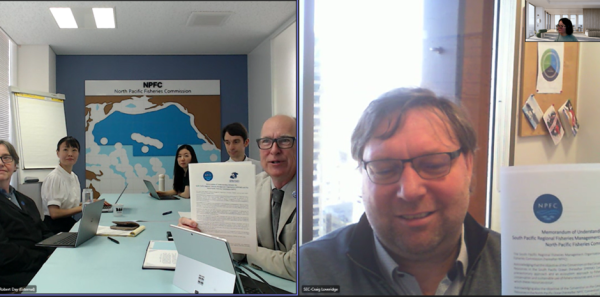 The Secretariats of the South Pacific Regional Fisheries Management Organisation (SPRFMO) and the North Pacific Fisheries Commission (NPFC) met virtually on 12 July 2023 to sign the Memorandum of Understanding (MoU) the Commissions of both organisations agreed on. Mr Craig Loveridge, Executive Secretary of SPRFMO, and Dr Robert Day, Executive Secretary of NPFC, signed the Memorandum and were joined by staff from both Secretariats.